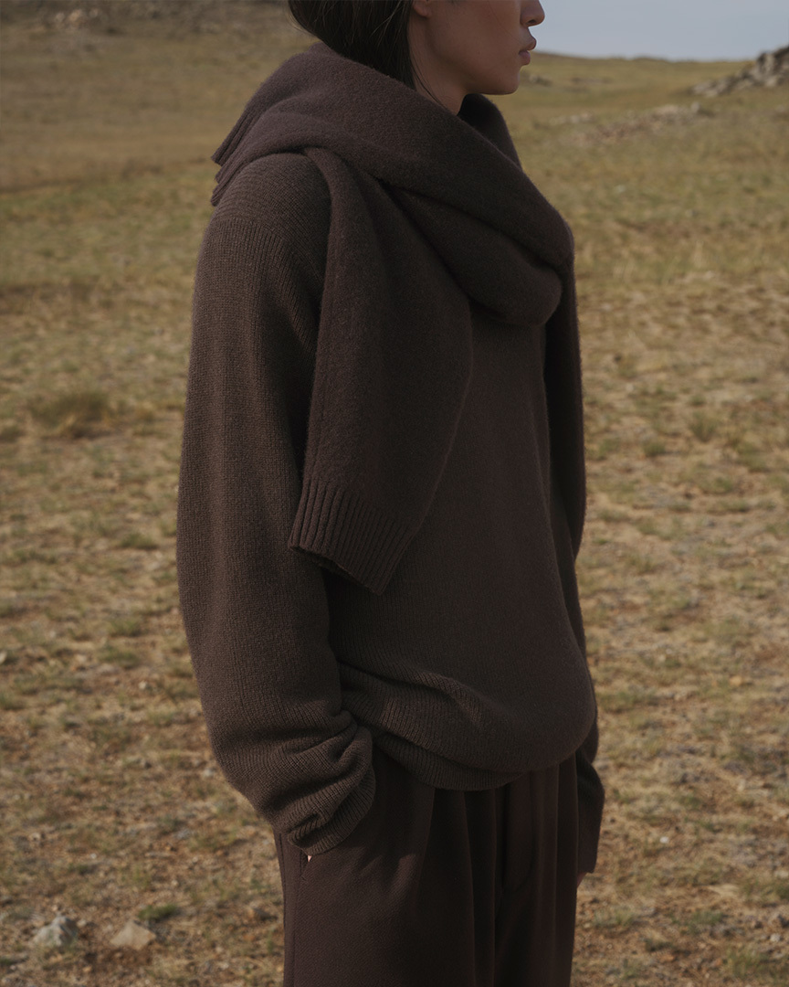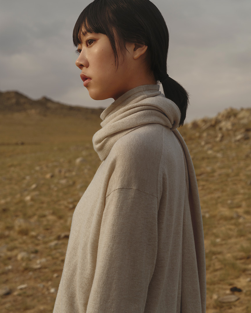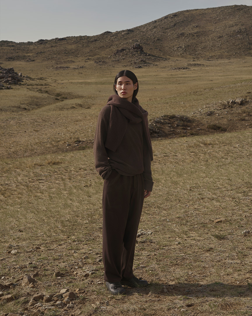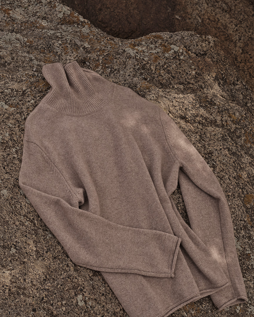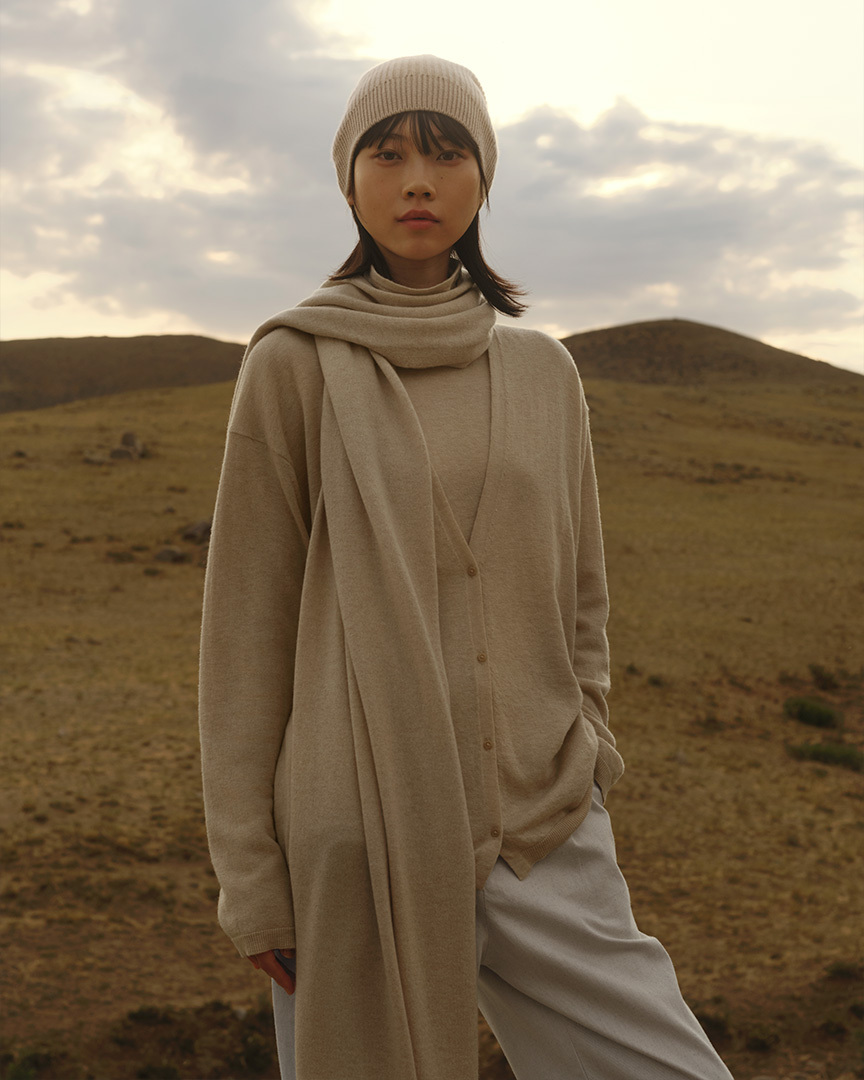 Dieses Material wird aus natürlich gefärbtem Kaschmir aus dem östlichen mongolischen Plateau hergestellt und ohne Bleichen veredelt, wodurch die schönen, natürlichen Farbtöne des Kaschmirs zur Geltung kommen. Es zeichnet sich durch sein reichhaltiges Volumen und seine außergewöhnlich weiche Textur aus.