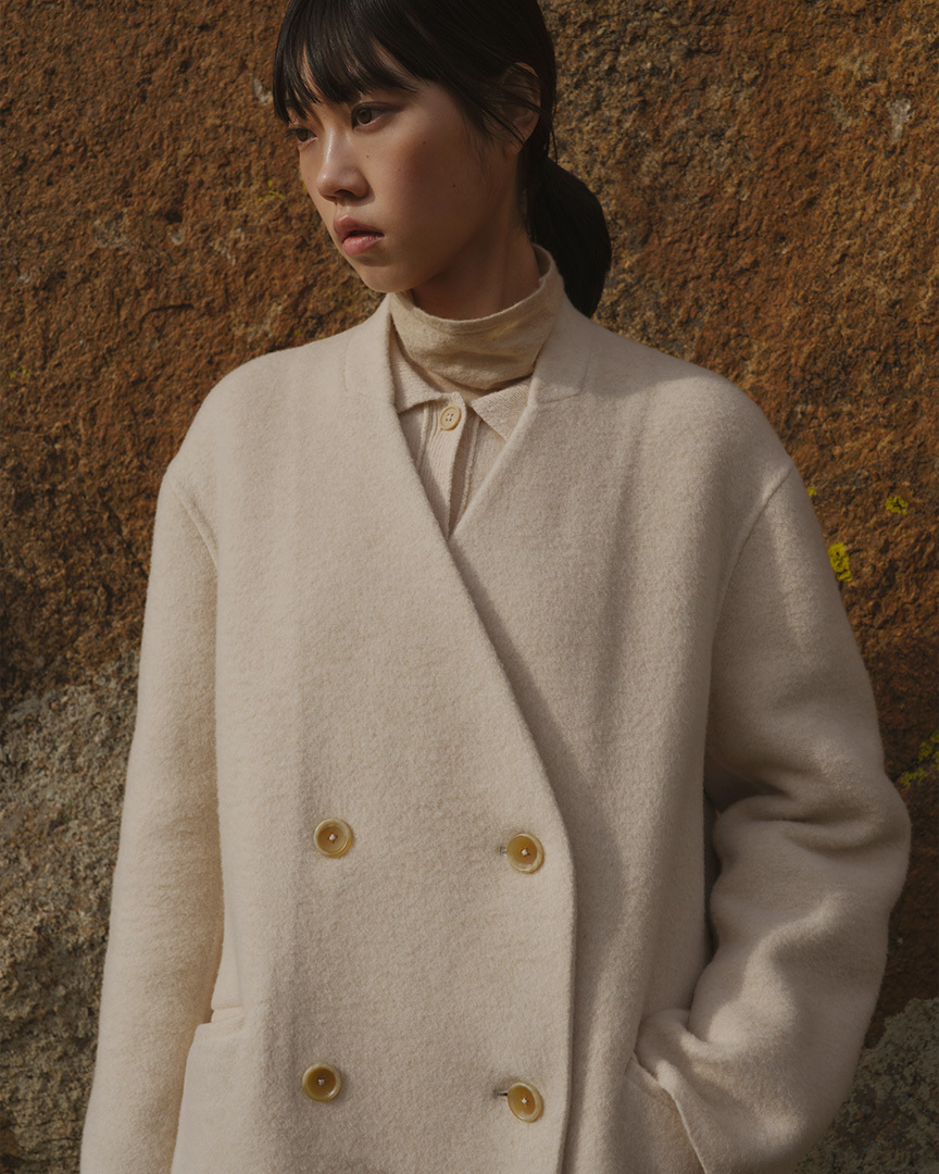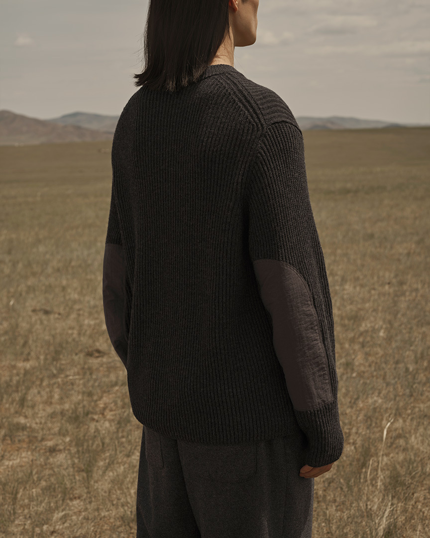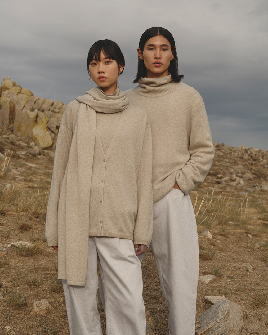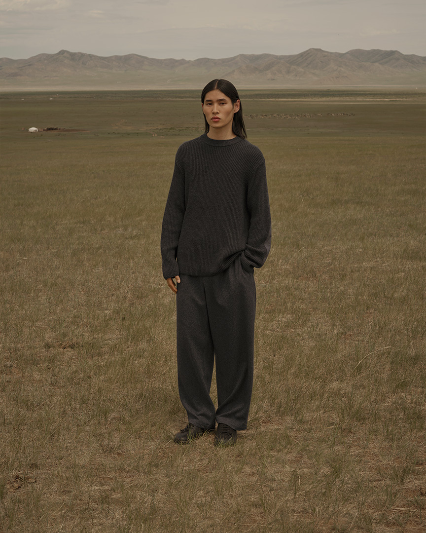 Dieses Material wird aus natürlich gefärbtem Kaschmir aus dem östlichen mongolischen Plateau hergestellt und ohne Bleichen veredelt, wodurch die schönen, natürlichen Farbtöne des Kaschmirs zur Geltung kommen. Es zeichnet sich durch sein reichhaltiges Volumen und seine außergewöhnlich weiche Textur aus.
